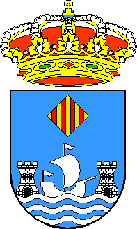 "Azure, atop waves of azure and argent two towers argent between which sails a caravel masted and sailed, all argent, surmounted by an Aragonese lozenge. Restored by royal decree of 29-X-1976"