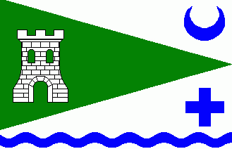 Coat of arms: Shield in Spanish shape. Azure two mounds surmounted dexter with a crescent and sinister with a cross all argent, grafted vert a castle argent masoned sable port and windows vert standing on fesses wavy argent and azure. The shield surmounted with a Royal crown closed.