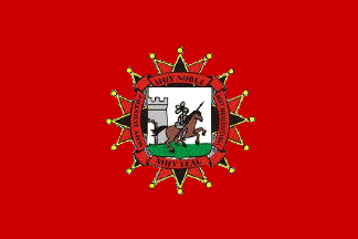 The flag of Arévalo (photo, 16 February 2011) is crimson red with the municipal coat of arms in the middle.