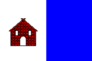 Flag: Rectangular flag, with proportions 2:3, made of two equal vertical stripes, at hoist white with a red house, at fly blue.