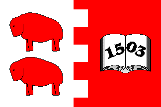 Flag: Rectangular flag with proportions 2:3, made of two equal vertical stripes embattled, at hoist white with two red boars, at fly red with an open white book charged with the numeral "1503".