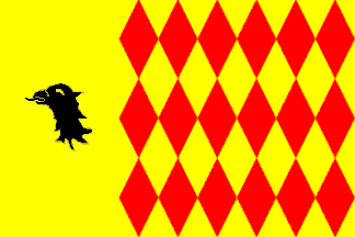 Yellow flag with a black eagle's head as high as 2/7 of the flag's height, centred on the first (hoist) third of the flag. The remaining two thirds of the flag show three rows and six columns of red lozenges. Ratio 2:3.