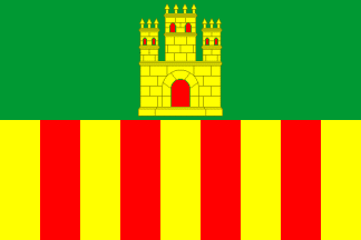 Horizontally divided, the top stripe dark green with a centred (see below) yellow castle with red gate and windows, as high as 4/9 of the flag's height, the bottom stripe vertically divided into nine yellow-red stripes. Ratio 2:3.