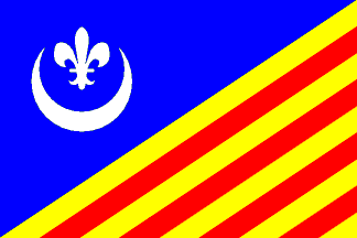 Keywords: gaia | gaià | triangle: top hoist (blue) | triangle: bottom fly (yellow) | crescent: points to top (white) | fleur-de-lis (white) |