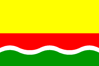 Horizontally striped flag, yellow-red-green in proportions 2+1+1, the bottom two stripes separated by a white wavy line as wide as 1/12 of the flag's height, showing three crests. Ratio 2:3.