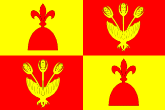 A quartered flag, the first and fourth quarters yellow with a red fleur-de-lys atop a red mount, the second and third quarters red with a yellow thistle plant. Thus a banner of the city arms, as it appears in Ralf Hartemink's International Civic Arms website.