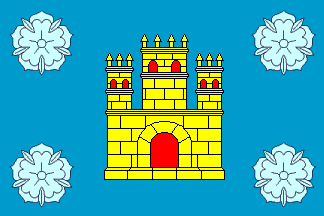 Blue flag with a yellow castle, red gate and windows. On each corner of the flag, a light blue heraldical rose.