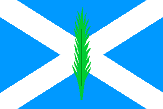 A light blue flag with a white saltire, overlaid with a vertical green palm leaf. Thus a banner of the city arms, as it appears in the Catalan Vexillological Association website.