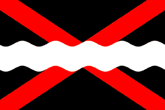 Black flag with a red saltire as wide as 1/6 of the flag's height, on top of it a white wavy stripe of the same width, showing five wave crests.
