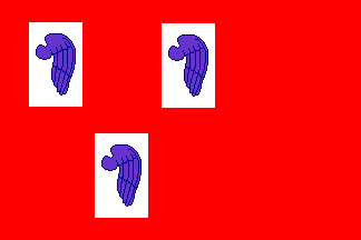 A red flag with three white upright, rectangular panels arranged 2,1 (on the upper hoist, centre top and mid-bottom hoist) each charged with a blue wing or demi-vol.