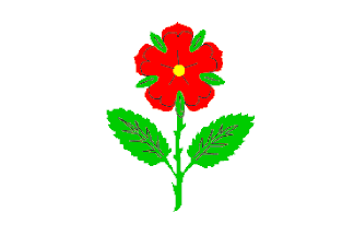 White flag with a [heraldic] red rose with yellow seeds and green barbs, stalk and [two] leaves, as high as 7/9 of the flag's height.