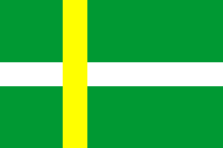 Green flag with a scandinavian cross made up of a yellow vertical arm over a white horizontal arm, both as wide as 1/6 of the flag's height and whose vertical arm is placed at the end of the first third of the flag's length. Colours from the coat-of-arms. The arms of the cross represent the [yellow] palm leaf and the [white] dog on the coat-of-arms, both of which stand for St Quitèria, patroness of the municipality. Ratio 2:3. Flag adopted 18th December 1992. Source for image and text: Fluvià 2001.