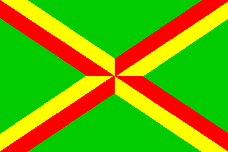 A green flag with a saltire gironny yellow and red. Colours from the city arms, as it appears in Ralf Hartemink's International Civic Arms website.
