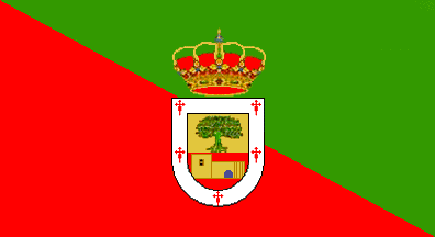 Flag made up of two triangles: red bottom hoist and green top fly. On its centre, the municipal arms, blazoned per fess Or a tree erradicated Vert and Gules a local house Or gate Azure; on a bordure Argent five crosses of the Order of Santiago; crest: a royal crown proper.