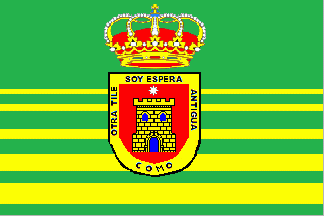 Coat of arms: Gules a tower or masoned sable port and windows azure ensigned by a star argent. A bordure argent inscribed with the writing "Soy Espera tan antigua como cualquiera". The shield surmounted by a Royal crown.