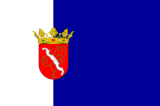 Flag: Rectangular panel in proportions 1:1.5, tierced at hoist [1:2]. The first area, at hoist, with proportions 1:3, white; the second area, the remaining 2:3, indigo blue. On the dividing line is placed the crowned coat of arms.