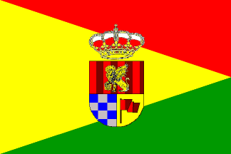 Keywords: pescueza | triangle: hoist (yellow) | triangle: top fly (red) | triangle: bottom fly (green) | coat of arms: per fess (lion: st mark) | coat of arms: per pale (chequy: blue-white) | coat of arms: per pale (flag: |