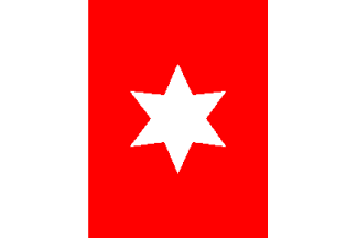 Vertically striped white-red-white, the central stripe wider than the other two and charged with a white six-pointed star.