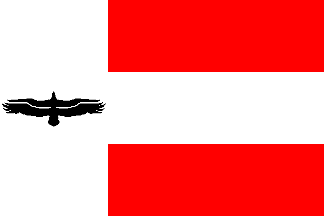Horizontally striped red-white-red, with a wide white hoist stripe bearing a black bird of prey (possibly a vulture) with wings displayed. Horcajo de los Montes is situated within Caballeros National Park, the world's second main breeding area of the black (or cinereous) vulture (Aegypius monachus).