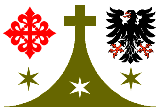 White flag with an olive green curvilinear triangle, its base occupying all the bottom side of the flag and ending in a Greek cross almost touching the top side; on the centre of the triangle, a white six-pointed star. On the top hoist and fly, respectively, a red cross of the Order of Calatrava and a black eagle wings displayed, with red beak, tongue and talons; beneath each, an olive green six-pointed star..