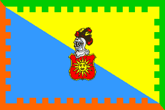 Flag made up of two triangles, blue bottom hoist and yellow top fly, with an embattled bordure which is orange on the hoist and bottom and green on the top and fly; the municipal arms centred (blazoned Gules a sun in splendour Or; crest: an esquire's helmet adorned with five plumes of feathers three of the field two of the second).