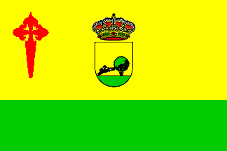 Yellow flag with a wide green stripe at the bottom; centred on the yellow area, the municipal arms and on the canton a red cross of the Order of Santiago (St James).