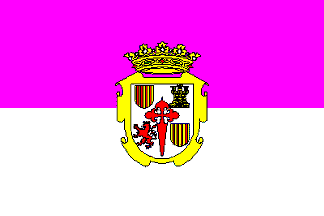 Horizontally striped purple over white flag with the municipal arms centred (blazoned Argent a cross of St James Gules between in dexter chief and sinister base an inescutcheon Or four pallets of the second in sinister chief a castle of the third masoned Sable and in dexter base a lion of the second; crest: an open royal crown proper).
