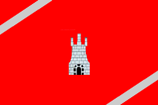 Flag in proportions 2:3. Gules (red) with two bends argent, charged in the middle with a castle argent masoned (with bricks) and open sable (black).