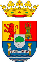 The coat-of-arms is divided horizontally: the upper half coupé per fess: dexter, gold, a lion rampant, red; sinister, red, a castle tower, gold; the lower half, blue the two Columns of Hercules, gold, under a silver scroll, reading PLVS VLTRA in black capitals, all on eight waves of silver and blue; over all, a silver escutcheon, charged with a cork oak in natural colors.