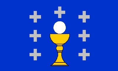 Azure, a chalix bearing the eucharistic bread, between two pales of three crosslets argent each, itself under another crosslet; royal crown, closed with five half-arches and padded red.