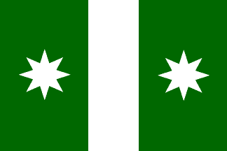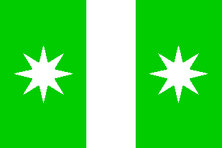 Vertically striped (dark) green-white-(dark) green, proportions 7+4+7. Centred on each green stripe, a white eight-pointed star with an (outer) diameter 1/3 of the flag's height. Ratio 2:3.