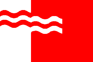 Red flag with a white hoist stripe as wide as 1/3 of the flag's length. Within an imaginary rectangle placed on the canton, as high as 43/100 of the flag's height and as long as 2/3 of the flag's length and set apart by 1/10 of the flag's height from the top of the flag, are inscribed four wavy stripes red-white-red-white, each as wide as 1/12 of the flag's height, showing two crests and two [beginning and end] half-crests, so that when their colour matches that of the field the stripe appears to merge seamlessly. Ratio 2:3.