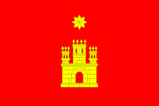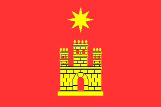 A red flag with a yellow castle and a yellow eight-pointed star above it. Thus a banner of the city arms, as it appears in the Catalan Vexillological Association website.