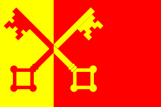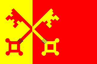 Red flag with a yellow hoist stripe as wide as 1/3 of the flag's length. Centred on the division line, two counterchanged keys crossed in saltire, separated from both top and bottom by 1/9 of the flag's height. Ratio 2:3.
