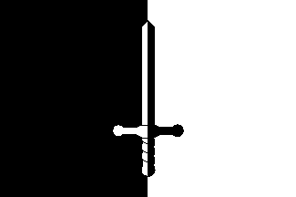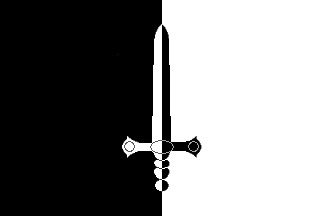 Vertically divided black and white flag with a centred vertical counterchanged sword. Ratio 2:3.