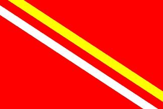 Red flag with three diagonal stripes from top hoist to bottom fly, yellow-red-white, each as wide as 1/10 of the flag's height.