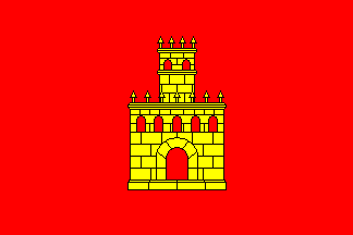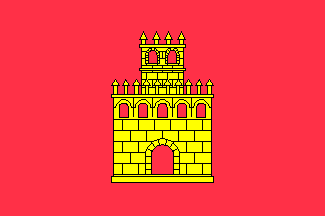Red flag with a yellow single-towered castle as high as 2/3 of the flag's height and as wide as 1/3 of the flag's length.