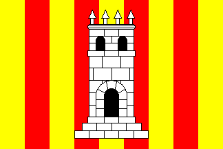The flag is a banner of the arms (blazoned Or, four pallets Gules, a tower Argent with gate and windows Sable). The tower (torre) is canting and the stripes are a reminder of the former jurisdiction of the kings of Aragon, who were at the same time barons of Torroella de Montgrí. Flag adopted 27th January 1995. Source for image and text: Fluvià 2001.