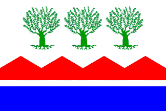 Flag: Rectangular flag, in proportions 2:3, made of four horizontal stripes, the two upper serrated by four triangles, in proportions 1/2, 2/9, 1/18 and 2/9, the upper white with three green uprooted olive trees and the other red, white and blue.