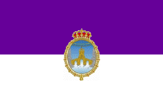 Flag: Rectangular flag, like the traditional flag,s divided in two equal horizontal stripes, the upper purple and the lower white, in the middle, on the two stripes, the coat of arms of the municipality.