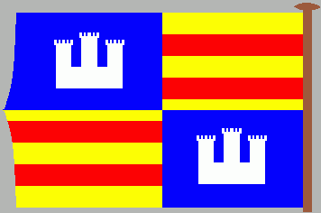 This depiction is of a quarterly-divided ogival pennant. The 1st and 4th quarters show two red bars in a golden (yellow) field. The 2nd and 3rd quarter show a three-towered, embattled silver (white) castle in a blue field. (Source: MERIAN, Jahrgang 40 (1987), Heft 2, p.108 (reverse); Primary Source: Cresques Abraham, “Mappa Mundi”, aka “Catalan Atlas of the World”, Palma de Mallorca, 1375)