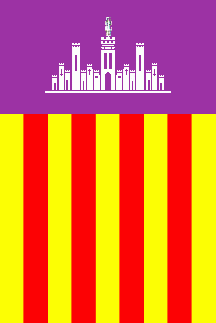 The flag is the Aragonese-Catalan flag – nine horizontal stripes yellow and red – with, in the hoist, a white castle rotated 90º counterclockwise on a purple field. On the central tower, a human figure in black. The figure appears to have a nimbus on its head and a lance, which makes me think of St. George. Pascal Gross's image is based on an official handbook of the Govern Balear (autonomous government) which details the community's flag and arms as well as those of the three island councils.
