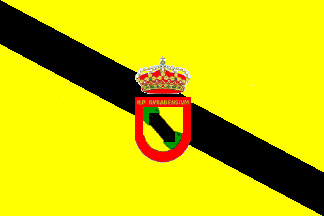 Flag: Rectangular flag, with the length one and a half the height, yellow (or) with a bend sable (black) of 1/5th of the hoist size. Centered and over the bend, the municipal coat of arms with a height equal to 1/2 of the flag's hoist.