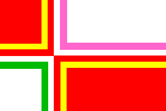 A quarterly per scandinavian cross red and white flag (i.e. a horizontally white over red flag, with a counterchanged vertical hoist stripe half as wide as the flag.) The inner borders of the top hoist and bottom fly quarters have a wide yellow fimbriation. The inner border of the top fly quarter has a wide pink fimbriation. The inner border of the bottom hoist quarter has a wide green fimbriation.