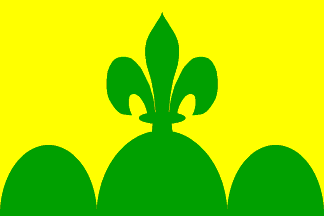 A yellow flag with a green triple mount, on top of the middle mount a green fleur-de-lys almost reaching the top.