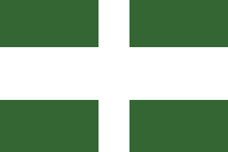 Ratio 2:3. (Dark) green flag with a white cross (throughout) whose vertical arm – representing the belfry of the church on the municipal coat-of-arms – is thinner (no proportions given) than the horizontal one. Both arms represent the belfry and the nave, respectively, of the church on the municipal coat-of-arms. Colours from the municipal coat-of-arms. Flag adopted 25th September 1992. Source for image and text: Fluvià 2001.