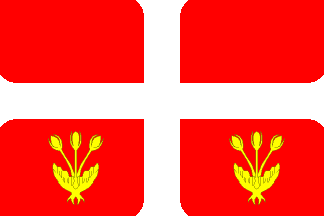 A red flag with a white formy cross. On each of the two bottom quarters, a yellow plant.