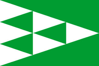 Green flag with six white triangles, all isosceles with a horizontal symmetry axis, as high and long as 1/3 of the flag's height and length, placed three with their bases on the hoist, two in the middle toughing the first three and a further one on the fly touching the second two. Ratio 2:3.