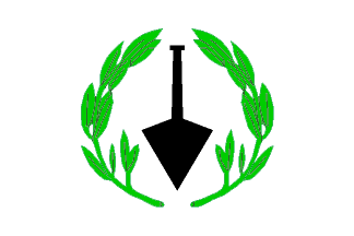 White with a black ploughshare as high as 7/9 of the flag's height, surrounded by two green olive branches. Ratio 2:3.