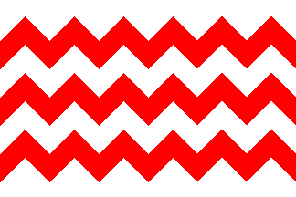 White flag with three horizontal zig-zag red stripes, each as wide as 1/7 of the flag's height, each with six points and a half on the top side and five points and a half on the bottom side.